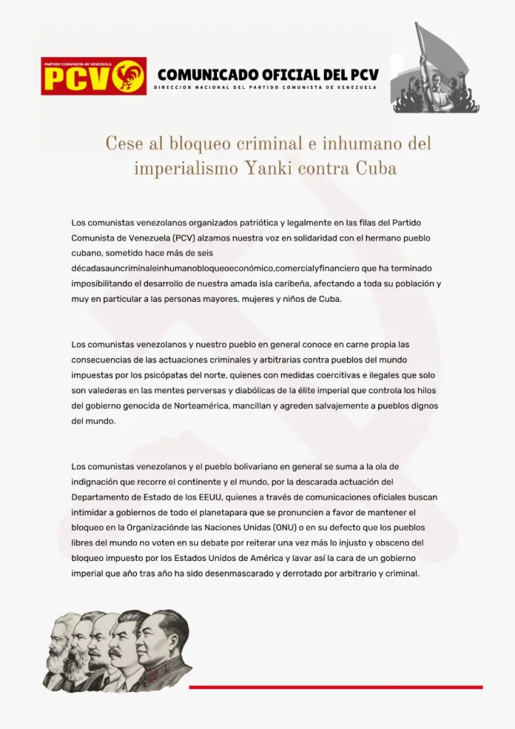 Los comunistas venezolanos organizados patriótica y legalmente en las filas del Partido Comunista de Venezuela (PCV) alzamos nuestra voz en solidaridad con el hermano pueblo cubano, sometido hace más de seis décadas a un criminal e inhumano bloqueo económico, comercial y financiero que ha terminado imposibilitando el desarrollo de nuestra amada isla caribeña, afectando a toda su población y muy en particular a las personas mayores, mujeres y niños de Cuba.